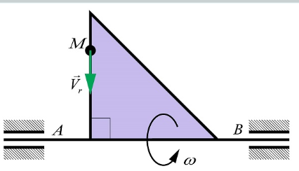 По стороне треугольника, вращающегося вокруг стороны AB с угловой скоростью ω, движется точка М с относительной скоростью νr = 3t2 м/с . Определить модуль относительного ускорения точки М в момент времени t = 5,5 с.
