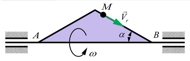 По стороне треугольника, вращающегося вокруг стороны AB с постоянной угловой скоростью ω = 1,2 рад/с, движется точка M с относительной скоростью νr. В момент времени, когда расстояние MB = 6,2 м, определить модуль переносного ускорения точки M, если угол α = 30°.