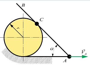 Стержень АB движется в вертикальной плоскости так, что его конец А скользит по горизонтальной прямой со скоростью vA = 3,3 м/с, а в точке С скользит по диску радиуса r м. Определить скорость точки С стержня в положении, когда угол α = 45°.