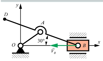 Для заданного положения четырехзвенного механизма определить мгновенную угловую скорость шатуна АВ, если точка В имеет скорость vB = 0,6 м/с, длина шатуна BD = 5,2 м, а вектор скорости точки D на ось Ох имеет проекцию VDx = 0,3 м/с.