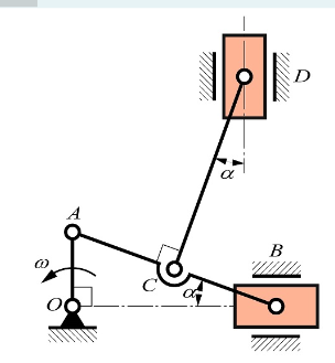 В шестизвенном механизме кривошип ОА длиной 0,3 м вращается равномерно с угловой скоростью ω = 7 рад/с. К шатуну АВ в точке С шарнирно прикреплен шатун CD. Для заданного положения механизма определить скорость точки D ползуна, если угол α = 20°.