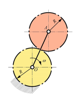 Кривошип планетарного механизма вращается с постоянной угловой скоростью ω = 4 рад/с. Определить ускорение точки, являющейся мгновенным центром скоростей подвижного колеса, если радиус R = 0,2 м.