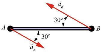 Стержень длиной АВ = 63 см движется в плоскости чертежа. В некоторый момент времени точки А и В стержня имеют ускорения аА = 3,6 м/с2 и а В = 2 м/с2. Определить угловое ускорение стержня.