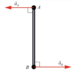 Стержень АВ длиной 59 см движется в плоскости чертежа. В некоторый момент времени точки А и В стержня имеют ускорения аА = 3,5 м/с2, а в = 9,6 м/с2. Определить угловое ускорение стержня.