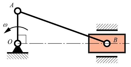 Определить ускорение ползуна В кривошипно-ползунного механизма в данном положении, если угловая скорость кривошипа ω = 2,3 рад/с = const; длины звеньев ОА = 0,4 м; АВ = 0,7 м.