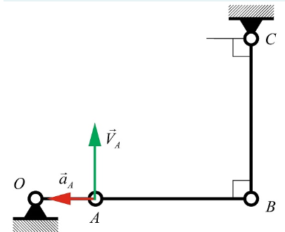 В указанном на рисунке положении шарнирного четырехзвенника скорость и ускорение точки А кривошипа ОА равны: vA = 5,4 м/с, аА = 7 м/с2. Определить ускорение точки В шатуна АВ, если длины АВ = ВС = 4,9 м.