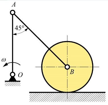 Определить угловое ускорение шатуна АВ кривошипного механизма в данном положении, если кривошип ОА вращается с постоянной угловой скоростью ω = 6,2 рад/с, а длины звеньев ОА = 6,9 м, АВ = 9 м.