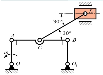 Кривошип ОА шарнирного параллелограмма ОАВО1 шестизвенного механизма равномерно вращается с угловой скоростью ω = 2 рад/с. Определить угловое ускорение шатуна CD в данном механизме, если длины звеньев ОА = 14 см, CD = 33 см.