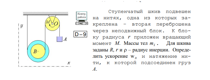 Ступенчатый шкив подвешен на нитях, одна из которых закреплена – вторая переброшена через неподвижный блок. К блоку радиуса r приложен вращающий момент M. Массы тел mi . Для шкива заданы R, r и – радиус инерции. Определить ускорение wВ и натяжение нити, к которой подсоединен груз A.