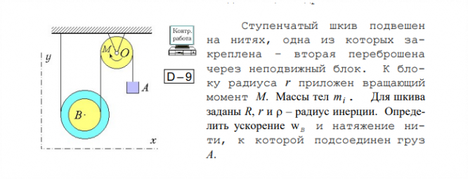Ступенчатый шкив подвешен на нитях, одна из которых закреплена – вторая переброшена через неподвижный блок. К блоку радиуса r приложен вращающий момент M. Массы тел mi . Для шкива заданы R, r и  – радиус инерции. Определить ускорение wВ и натяжение нити, к которой подсоединен груз A.
