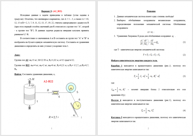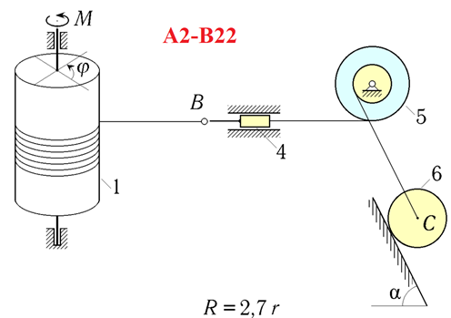 Исходные данные к задаче приведены в таблице (углы заданы в градусах). Отметим, что цилиндры в вариантах, где A = 1-3, а также A = 10,12, 15 и B = 2,3,7,9,11,12,13,17,19,22, cчитать однородными c радиусом R (при этом первый столбец значений для R относится к группе тел \"A\", второй - к группе тел \"B\"). В данных задачах paдиусы инерции катушек принять равными 0,7*R. В соответствии со значениями A и B составить из групп тел \"A\" и \"B\" и изобразить на бумаге единую механическую систему. Составить ее уравнения движения и определить из них угловое ускорение тела 1..