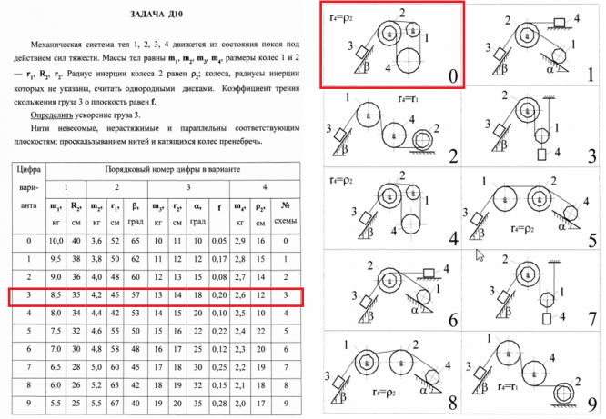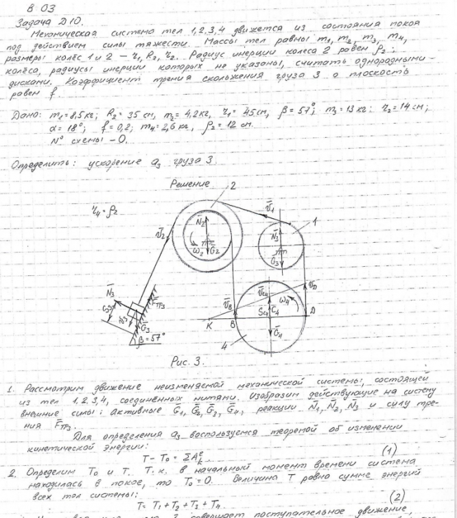 Главная » Учебные материалы » Теоретическая механика » Решения задач » Несколько классов/семестров » Номер Д10 » Вариант 03 » Механическая система тел 1, 2, 3, 4 движется из состояния покоя под действием сил тяжести. Массы тел равны m1, m2, m3, m4, размеры колес 1 и 2 – r1, R1,r2. Радиус инерции колеса 2 равен р₂; колеса, радиусы инерции которых не указаны, считать однородн