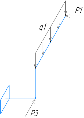 Пространственная система, состоящая из трех стержней, жестко соединенных между собой под прямым углом, нагружена расчетной нагрузкой в вертикальной и горизонтальной плоскостях. Стержни системы имеют различные длины.