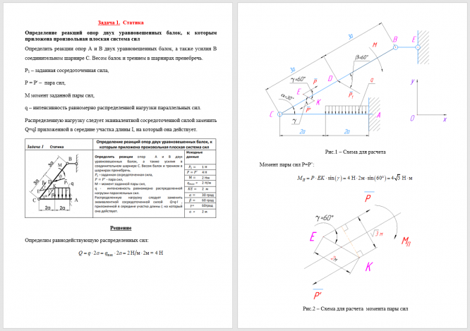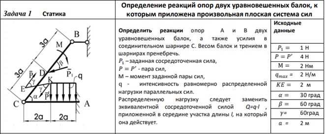 Определение реакций опор двух уравновешенных балок, к которым приложена произвольная плоская система сил Определить реакции опор A и B двух уравновешенных балок, a также усилия B соединительном шарнире С. Весом балок и трением в шарнирах пренебречь. Р1 – заданная сосредоточенная сила, Р = Р\' – пара сил, M момент заданной пары сил, q – интенсивность равномерно распределенной нагрузки параллельных сил. Распределенную нагрузку следует эквивалентной сосредоточенной силой заменить Q=ql приложенной в середине участка длины І, на который она действует..