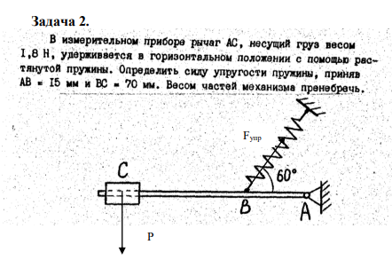В измерительном приборе рычаг АС, несущий груз весом 1,8 Н, удерживается в горизонтальном положении с помощью растянутой пружины. Определить силу упругости пружины, приняв АВ = 15 мм и ВС = 70 мм. Весом частей механизма пренебречь.