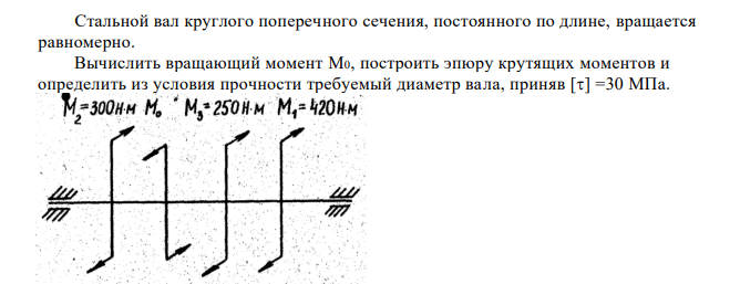 Стальной вал круглого поперечного сечения, постоянного по длине, вращается равномерно. Вычислить вращающий момент М0, построить эпюру крутящих моментов и определить из условия прочности требуемый диаметр вала, приняв [] =30 МПа.