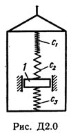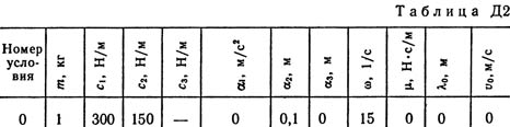 В таблице обозначено: c1, с2, c3 - коэффициенты жесткости пружин, λ0 - удлинение пружины с эквивалентной жесткостью в начальный момент времени t = 0, v0 - начальная скорость груза по отношению к лифту (направлена вертикально вверх). Прочерк в столбцах c1, с2, c3 означает, что соответствующая пружина отсутствует и на чертеже изображаться не должна. Если при этом конец одной из оставшихся пружин окажется свободным, его следует прикрепить в соответствующем месте или к грузу или к потолку (полу) лифта; то же следует сделать, если свободными окажутся соединенные планкой 2 концы обеих оставшихся пружин.