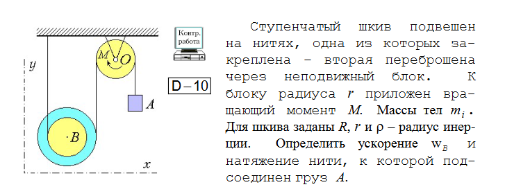 Ступенчатый шкив подвешен на нитях, одна из которых за- креплена – вторая переброшена через неподвижный блок. К блоку радиуса r приложен вра- щающий момент M. Массы тел mi . Для шкива заданы R, r и  – радиус инер- ции. Определить ускорение wВ и натяжение нити, к которой под- соединен груз A..