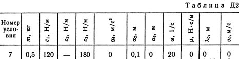 В таблице обозначено: c1, с2, c3 - коэффициенты жесткости пружин, λ0 - удлинение пружины с эквивалентной жесткостью в начальный момент времени t = 0, v0 - начальная скорость груза по отношению к лифту (направлена вертикально вверх). Прочерк в столбцах c1, с2, c3 означает, что соответствующая пружина отсутствует и на чертеже изображаться не должна. Если при этом конец одной из оставшихся пружин окажется свободным, его следует прикрепить в соответствующем месте или к грузу или к потолку (полу) лифта; то же следует сделать, если свободными окажутся соединенные планкой 2 концы обеих оставшихся пружин.