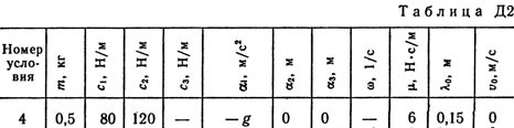 В таблице обозначено: c1, с2, c3 - коэффициенты жесткости пружин, λ0 - удлинение пружины с эквивалентной жесткостью в начальный момент времени t = 0, v0 - начальная скорость груза по отношению к лифту (направлена вертикально вверх). Прочерк в столбцах c1, с2, c3 означает, что соответствующая пружина отсутствует и на чертеже изображаться не должна. Если при этом конец одной из оставшихся пружин окажется свободным, его следует прикрепить в соответствующем месте или к грузу или к потолку (полу) лифта; то же следует сделать, если свободными окажутся соединенные планкой 2 концы обеих оставшихся пружин.