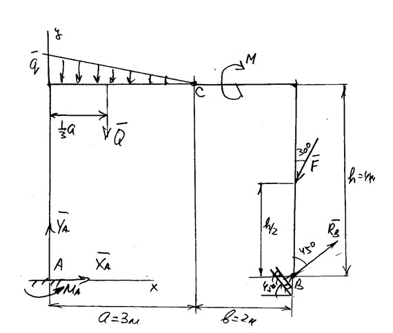 Исходные данные: q = 4 кН/м, h = 4 м, а = 3 м, b = 2 м, F = 10 кН, м = 4 кНм