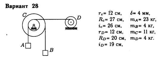Механическая система состоит из тел, взаимосвязанных между собой нерастяжимой нитью. Под действием сил тяжести система из состояния покоя приходит в движение. Какую скорость приобретет груз A, переместившись (вверх или вниз) на расстояние S ì 1 ? Качение цилиндра (или блока) происходит без проскальзывания с коэффициентом трения качения –  . Коэффициент трения скольжения – f . Радиусы инерции – C i , D i . Внешние радиусы – RC , RD . Внутренние радиусы – C r , D r . Кроме того, определить с каким ускорением будет двигаться груз A в этот момент времени.