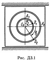 Механическая система состоит из грузов D1 массой m1 = 2 кг и D2 массой m2 = 6 кг и из прямоугольной вертикальной плиты массой m3 = 12 кг, движущейся вдоль горизонтальных направляющих (рис. Д3.0 - Д3.9, табл. Д3). В момент времени t0 = 0, когда система находилась в покое, под действием внутренних сил грузы начинают двигаться по желобам, представляющим собой окружности радиусов r = 0,4 м и R = 0,8 м.