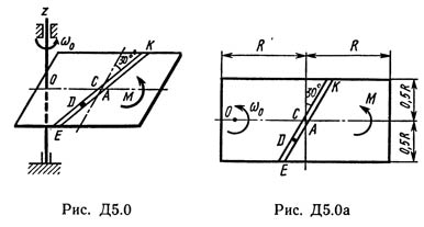 Однородная горизонтальная платформа (круглая радиуса R или прямоугольная со сторонами R и 2R, где R = 1,2 м) массой m1 = 24 кг вращается с угловой скоростью ω0 = 10 с-1 вокруг вертикальной оси z, отстоящей от центра масс C платформы на расстоянии OC = b (рис. Д5.0 - Д5.9, табл. Д5); размеры для всех прямоугольных платформ показаны на рис. Д5.0а (вид сверху).