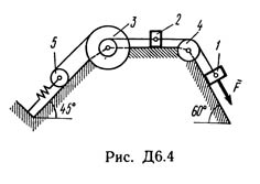 Механическая система состоит из грузов 1 и 2, ступенчатого шкива 3 с радиусами ступеней R3 = 0,3 м, r3 = 0,1 м и радиусом инерции относительно оси вращения ρ3 = 0,2 м, блока 4 радиуса R4 = 0,2 м и катка (или подвижного блока) 5 (рис. Д6.0 - Д6.9, табл. Д6); тело 5 считать сплошным однородным цилиндром, а массу блока 4 - равномерно распределенной по ободу. Коэффициент трения грузов о плоскость f = 0,1. Тела системы соединены друг с другом нитями, перекинутыми через блоки и намотанными на шкив 3 (или на шкив и каток); участки нитей параллельны соответствующим плоскостям. К одному из тел прикреплена пружина с коэффициентом жесткости c.