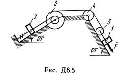 Механическая система состоит из грузов 1 и 2, ступенчатого шкива 3 с радиусами ступеней R3 = 0,3 м, r3 = 0,1 м и радиусом инерции относительно оси вращения ρ3 = 0,2 м, блока 4 радиуса R4 = 0,2 м и катка (или подвижного блока) 5 (рис. Д6.0 - Д6.9, табл. Д6); тело 5 считать сплошным однородным цилиндром, а массу блока 4 - равномерно распределенной по ободу. Коэффициент трения грузов о плоскость f = 0,1. Тела системы соединены друг с другом нитями, перекинутыми через блоки и намотанными на шкив 3 (или на шкив и каток); участки нитей параллельны соответствующим плоскостям. К одному из тел прикреплена пружина с коэффициентом жесткости c.