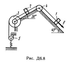 Механическая система состоит из грузов 1 и 2, ступенчатого шкива 3 с радиусами ступеней R3 = 0,3 м, r3 = 0,1 м и радиусом инерции относительно оси вращения ρ3 = 0,2 м, блока 4 радиуса R4 = 0,2 м и катка (или подвижного блока) 5 (рис. Д6.0 - Д6.9, табл. Д6); тело 5 считать сплошным однородным цилиндром, а массу блока 4 - равномерно распределенной по ободу. Коэффициент трения грузов о плоскость f = 0,1. Тела системы соединены друг с другом нитями, перекинутыми через блоки и намотанными на шкив 3 (или на шкив и каток); участки нитей параллельны соответствующим плоскостям. К одному из тел прикреплена пружина с коэффициентом жесткости c.