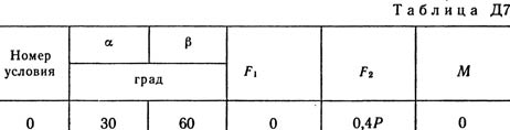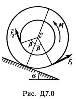 Барабан радиуса R весом P имеет выточку (как у катушки) радиуса r = 0,6R (рис. Д7.0 - Д7.9, табл. Д7). К концам намотанных на барабан нитей приложены постоянные силы F1 и F2, направления которых определяются углом β; кроме сил на барабан действует пара с моментом М; когда в таблице М < 0, направление момента противоположно показанному на рисунке. При движении, начинающемся из состояния покоя, барабан катится без скольжения по шероховатой наклонной плоскости с углом наклона α так, как показано на рисунках.