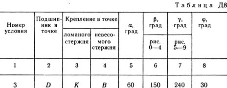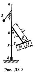 Вертикальный вал АК (рис. Д8.0 - Д8.9), вращающийся с постоянной угловой скоростью ω = 10 с-1, закреплен подпятником в точке A и цилиндрическим подшипником в точке, указанной в табл. Д8 в столбце 2 (АВ = BD = DE = ЕК = a). К валу жестко прикреплены тонкий однородный ломаный стержень массой m = 10 кг, состоящий из частей 1 и 2 (размеры частей стержня показаны на рисунках, где b = 0,1 м, а их массы m1 и m2 пропорциональны длинам), и невесомый стержень длиной l = 4b с точечной массой m3 = 3 кг на конце; оба стержня лежат в одной плоскости. Точки крепления стержней указаны в таблице в столбцах 3 и 4, а углы α, β, γ, φ даны в столбцах 5 - 8.