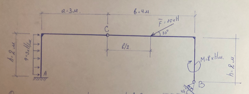 Дано: a = 3 м; b= 4 м; h = 2 м; q =3 кН/м; F = 10 кН; М = 8 кНм. Требуется определить реакции опор А, B и усилие в сочленении С, возникающее под действием нагрузки.