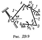 На ползун В механизма действует сила упругости пружины F; численно F = сλ, где с - коэффициент жесткости пружины, λ - ее деформация. Кроме того, на рис. 0 и 1 на ползун D действует сила Q, а на кривошип O1А - пара сил с моментом М; на рис. 2 - 9 на кривошипы O1А и O2D действуют пары сил с моментами М1 и M2. Определить, чему равна при равновесии деформация λ пружины, и указать, растянута пружина или сжата. Значения всех заданных величин приведены в табл. Д9а для рис. 0 - 4 и в табл. Д9б для рис. 5 - 9, где Q выражено в ньютонах, а М, М1, М2 - в ньютонометрах.
