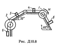 Механическая система состоит из однородных ступенчатых шкивов 1 и 2, обмотанных нитями, грузов 3 - 6, прикрепленных к этим нитям, и невесомого блока (рис. Д10.0 - Д10.9, табл. Д10). Система движется в вертикальной плоскости под действием сил тяжести и пары сил с моментом М, приложенной к одному из шкивов. Радиусы ступеней шкива 1 равны: R1 = 0,2 м, r1 = 0,1 м, а шкива 2 - R2 = 0,3 м, r2 = 0,15 м; их радиусы инерции относительно осей вращения равны соответственно ρ1 = 0,1 м и ρ2 = 0,2 м.