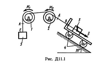 На систему кроме сил тяжести действует сила F, приложенная к телу 3 или 4 (если тело 3 в систему не входит, сила приложена в точке В к тележке), и пары сил с моментами М1, M2, приложенные к блокам 1 и 2; когда М < 0, направление момента противоположно показанному на рисунке.