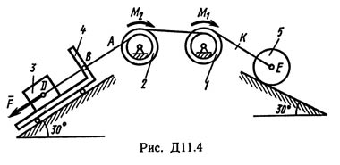На систему кроме сил тяжести действует сила F, приложенная к телу 3 или 4 (если тело 3 в систему не входит, сила приложена в точке В к тележке), и пары сил с моментами М1, M2, приложенные к блокам 1 и 2; когда М < 0, направление момента противоположно показанному на рисунке.