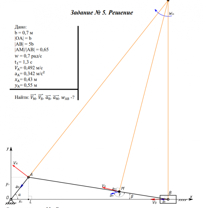 Указание. Вычислить ускорение точки B, угловое ускорение звена AB и ускорение точки М.