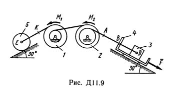На систему кроме сил тяжести действует сила F, приложенная к телу 3 или 4 (если тело 3 в систему не входит, сила приложена в точке В к тележке), и пары сил с моментами М1, M2, приложенные к блокам 1 и 2; когда М < 0, направление момента противоположно показанному на рисунке.