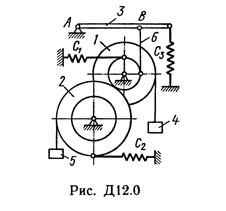 Механизм, расположенный в вертикальной плоскости (рис. Д12.0 - Д12.9), состоит из ступенчатых колес 1 и 2 с радиусами R1 = 0,4 м, r1 = 0,2 м, R2 = 0,5 м, r2 = 0,3 м, имеющих неподвижные оси вращения; однородного стержня 3 длиной l =1,2 м, закрепленного шарниром на одном из концов; грузов 4 и 5, подвешенных к нитям, намотанным на колеса. На стержне расстояние АВ = 2l/3.