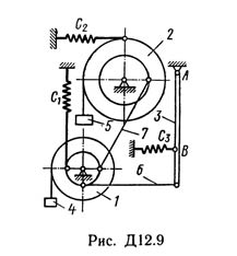 В табл. Д12 заданы массы mi тел (кг) и коэффициенты жесткости ci пружин (Н/м). Прочерки в столбцах таблицы означают, что соответствующие тела или пружины в систему не входят (на чертеже эти тела и пружины не изображать); в результате в каждом конкретном варианте получается довольно простой механизм, содержащий три или даже два тела. Стержень 6 или 7 входит в состав механизма, когда в него входят оба тела, соединенные этим стержнем.