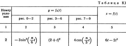 Найти уравнение траектории точки; для момента времени t1 = 1 с определить скорость и ускорение точки, а также ее касательное и нормальное ускорения и радиус кривизны в соответствующей точке траектории. Зависимость x = f1(t) указана непосредственно на рисунках, а зависимость y = f2(t) дана в табл. K1 (для рис. 0 - 2 в столбце 2, для рис. 3 - 6 в столбце 3, для рис. 7 - 9 в столбце 4). Как и в задачах С1 - С4, номер рисунка выбирается по предпоследней цифре шифра, а номер условия в табл. К1 - по последней.