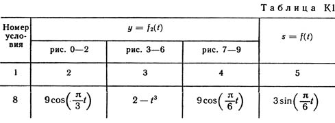 Найти уравнение траектории точки; для момента времени t1 = 1 с определить скорость и ускорение точки, а также ее касательное и нормальное ускорения и радиус кривизны в соответствующей точке траектории. Зависимость x = f1(t) указана непосредственно на рисунках, а зависимость y = f2(t) дана в табл. K1 (для рис. 0 - 2 в столбце 2, для рис. 3 - 6 в столбце 3, для рис. 7 - 9 в столбце 4). Как и в задачах С1 - С4, номер рисунка выбирается по предпоследней цифре шифра, а номер условия в табл. К1 - по последней.