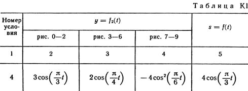 Найти уравнение траектории точки; для момента времени t1 = 1 с определить скорость и ускорение точки, а также ее касательное и нормальное ускорения и радиус кривизны в соответствующей точке траектории. Зависимость x = f1(t) указана непосредственно на рисунках, а зависимость y = f2(t) дана в табл. K1 (для рис. 0 - 2 в столбце 2, для рис. 3 - 6 в столбце 3, для рис. 7 - 9 в столбце 4). Как и в задачах С1 - С4, номер рисунка выбирается по предпоследней цифре шифра, а номер условия в табл. К1 - по последней.