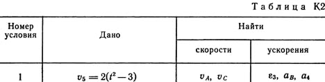 Определить в момент времени t1 = 2 с указанные в таблице в столбцах "Найти" скорости (v - линейные, ω - угловые) и ускорения (а - линейные, ε - угловые) соответствующих точек или тел (v5 - скорость груза 5 и т. д.).