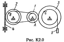 Механизм состоит из ступенчатых колес 1 - 3, находящихся в зацеплении или связанных ременной передачей, зубчатой рейки 4 и груза 5, привязанного к концу нити, намотанной на одно из колес (рис. К2.0 - К2.9, табл. К2). Радиусы ступеней колес равны соответственно: у колеса 1 - r1 = 2 см, R1 = 4 см, у колеса 2 - r2 = 6 см, R2 = 8 см, у колеса 3 - r3 = 12 см, R3 = 16 см. На ободьях колес расположены точки A, В и С.