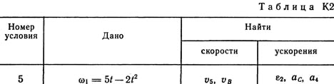 В столбце "Дано" таблицы указан закон движения или закон изменения скорости ведущего звена механизма, где φ1(t) - закон вращения колеса 1, s2(f) - закон движения рейки 4, ω2(t) - закон изменения угловой скорости колеса 2, v5(t) - закон изменения скорости груза 5 и т. д. (везде φ выражено в радианах, s - в сантиметрах, t - в секундах). Положительное направление для φ и ω против хода часовой стрелки, для s4, s5 и v4, v5 - вниз.