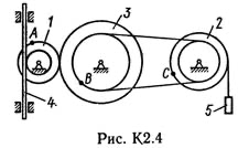 Механизм состоит из ступенчатых колес 1 - 3, находящихся в зацеплении или связанных ременной передачей, зубчатой рейки 4 и груза 5, привязанного к концу нити, намотанной на одно из колес (рис. К2.0 - К2.9, табл. К2). Радиусы ступеней колес равны соответственно: у колеса 1 - r1 = 2 см, R1 = 4 см, у колеса 2 - r2 = 6 см, R2 = 8 см, у колеса 3 - r3 = 12 см, R3 = 16 см. На ободьях колес расположены точки A, В и С.