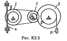 Механизм состоит из ступенчатых колес 1 - 3, находящихся в зацеплении или связанных ременной передачей, зубчатой рейки 4 и груза 5, привязанного к концу нити, намотанной на одно из колес (рис. К2.0 - К2.9, табл. К2). Радиусы ступеней колес равны соответственно: у колеса 1 - r1 = 2 см, R1 = 4 см, у колеса 2 - r2 = 6 см, R2 = 8 см, у колеса 3 - r3 = 12 см, R3 = 16 см. На ободьях колес расположены точки A, В и С.
